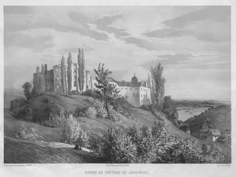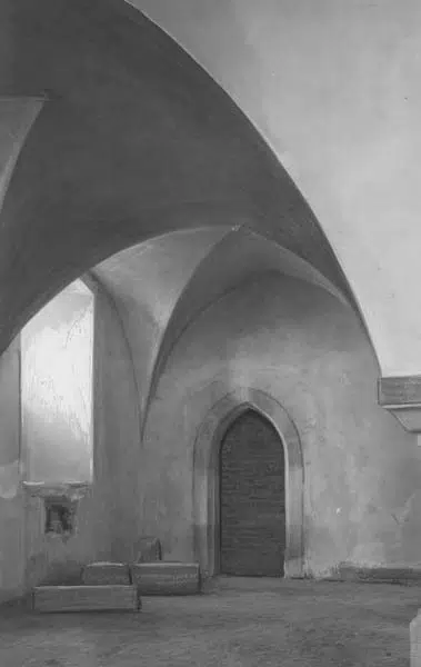 W połowie XIV wieku wzniesiono murowany zamek na nieregularnym trapezoidalnym planie. Początkowo składał się z dwukondygnacyjnego budynku mieszkalnego oraz kwadratowej wieży, przy której znajdowała się brama. W mieszkalnym skrzydle zachodnim znajdowały się refektarz od południa oraz kaplica od północy. Na przełomie XIV i XV wieku zamek otoczono ceglanym murem obronnym sięgającym 9 m wysokości.